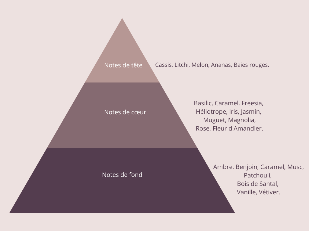Il mélange des notes fruitées telles que le cassis et la framboise avec des touches florales, créant ainsi une senteur sucrée et sensuelle.